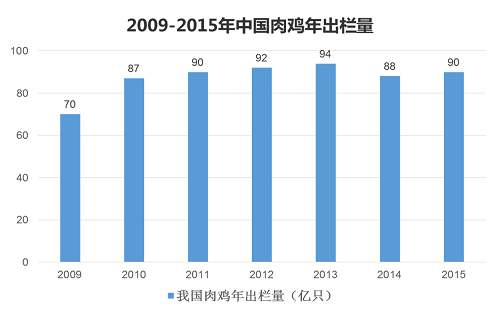 2009-2015年,中國肉雞年出欄量從2009-2011年高速增長(zhǎng)后增長(zhǎng)放緩,年出欄量保持平穩(wěn)中小幅調(diào)整的趨勢(shì)。肉雞是最便宜的動(dòng)物蛋白食品。