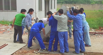 午飯后,大家顧不上休息。來自各個部門的十五六名青壯年,聚集在設備安裝現(xiàn)場。在郝康廠長的帶領和指揮下,所有人一共分為三個小組。第一個小組負責在混合機下面鋪設鋼管,使二維混合機能始終在鋼管上滾動。第二個小組在后面,負責推、撬動混合機。第三個小組則在前面依靠纜繩使勁地拉動混合機。在“一、二、三”的吶喊聲中,大家配合的很默契,二維混合機也朝著預定的方向蠕動著。一兩個小時過去了,大家的聲音變得嘶啞了,衣服也都被汗水浸透了。值得欣慰的是,二維混合機最后以“倒車入庫”的方式準確、安全地定位了。